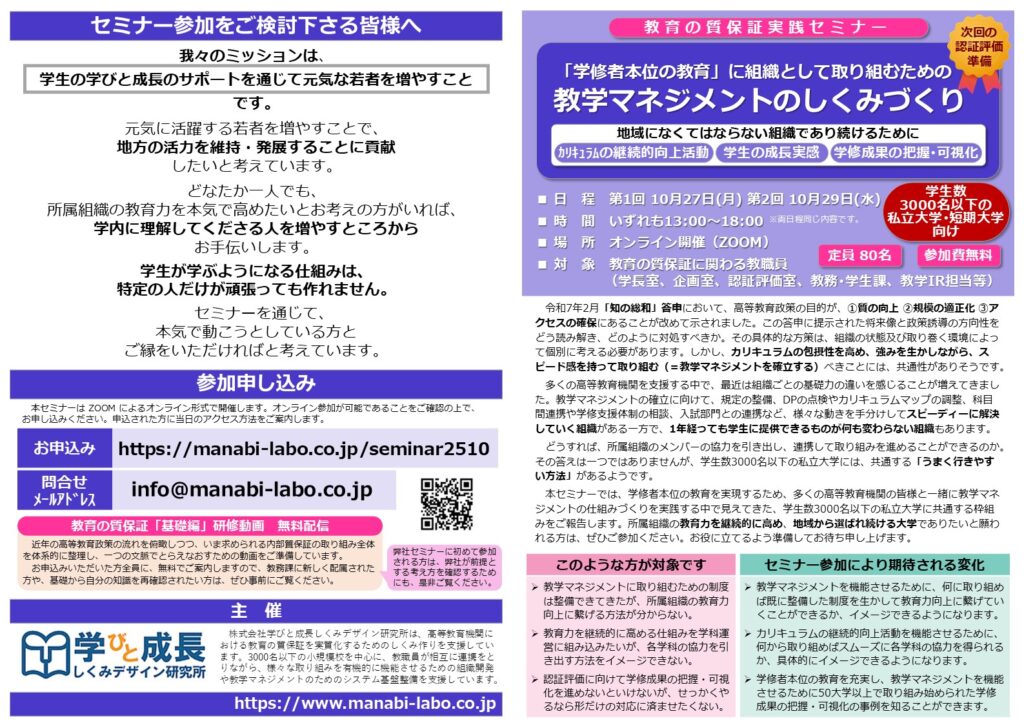 本セミナーでは、学修者本位の教育を実現するため、多くの高等教育機関の皆様と一緒に教学マネジメントの仕組みづくりを実践する中で見えてきた、学生数3000名以下の私立大学に共通する枠組みをご報告します。所属組織の教育力を継続的に高め、地域から選ばれ続ける大学でありたいと願われる方は、ぜひご参加ください。お役に立てるよう準備してお待ち申し上げます。